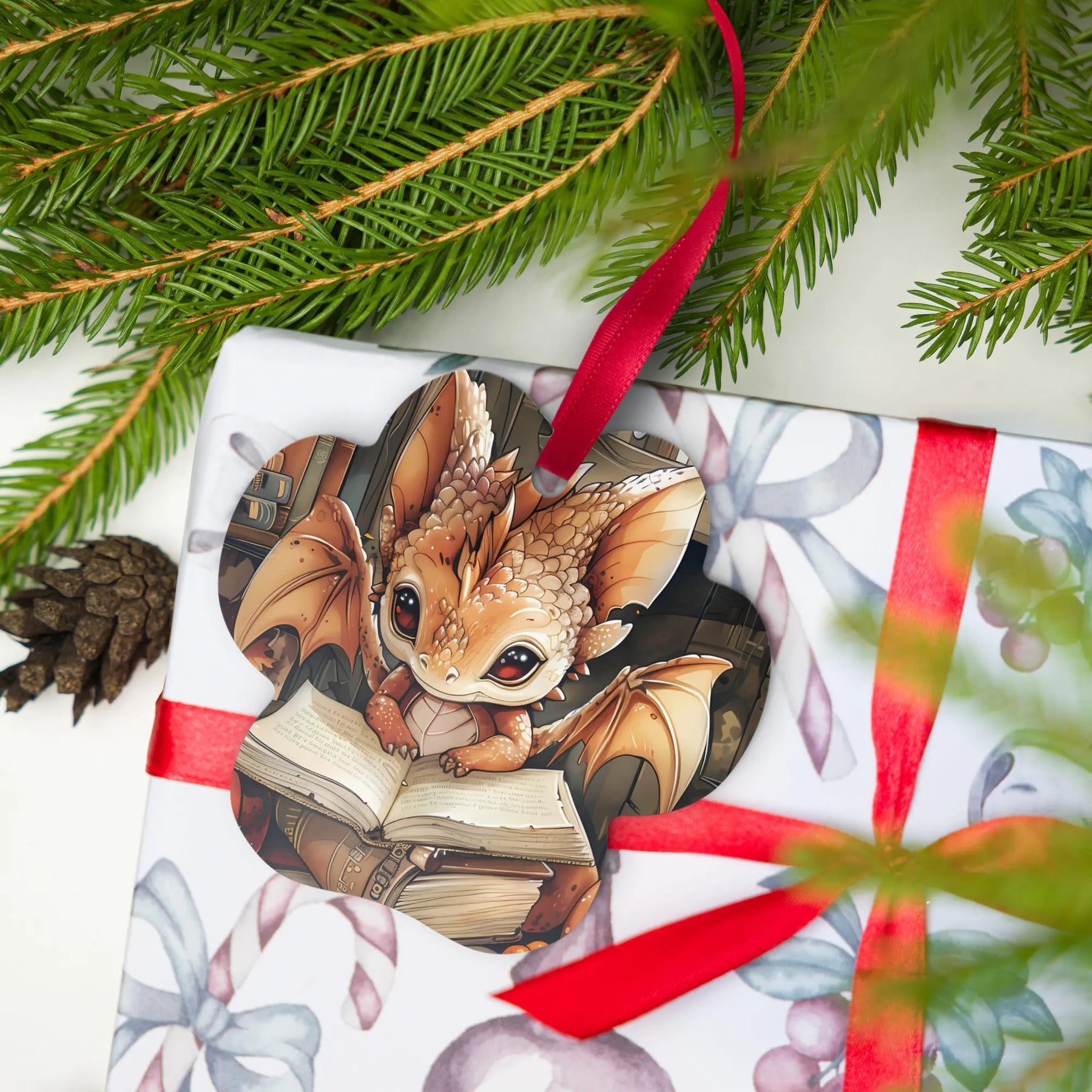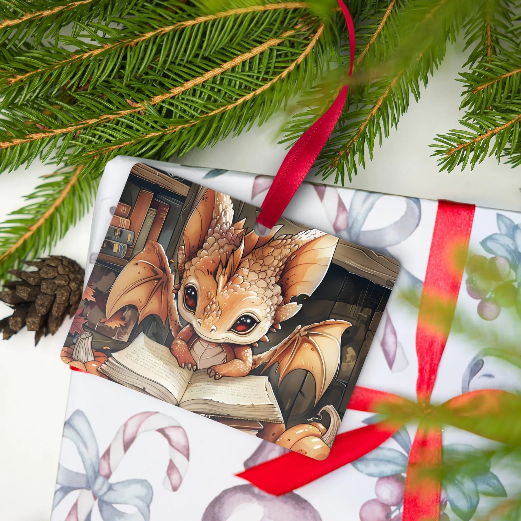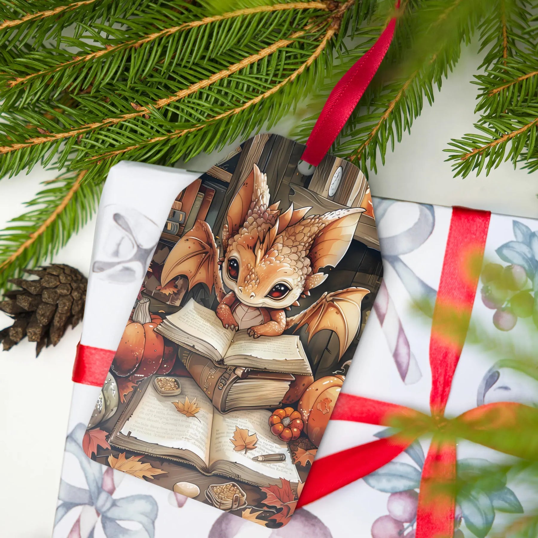 These metal Christmas ornaments dangle beautifully from rich red ribbon, featuring the adorable baby book dragon who is also a great lover of pumpkins.